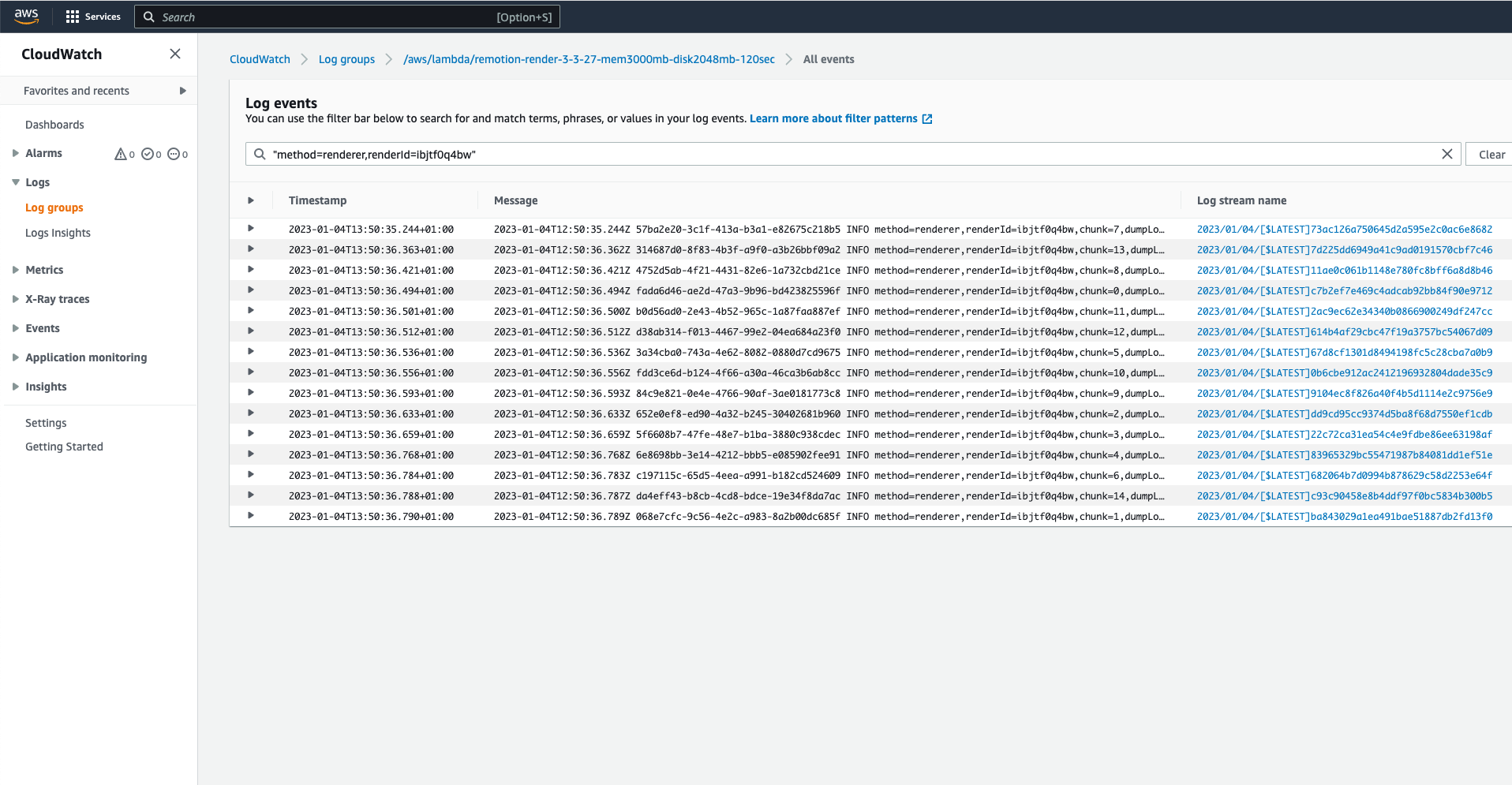 In the logstream, you will see debug logging from Remotion as well as any console.log statements from your React code.